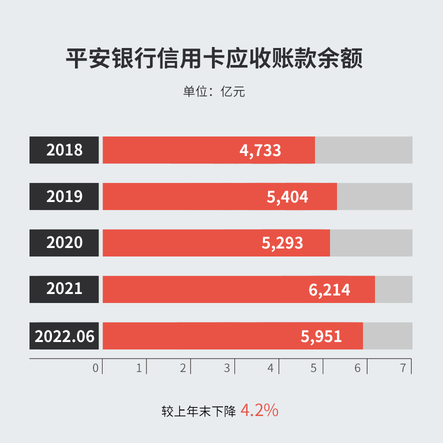截至2022年6月末,平安银行信用卡应收账款余额5,951.48亿元,较上年末下降 4.2%,但上半年信用卡应收账款日均余额 6,101.92 亿元,较去年全年增长 8.8%。