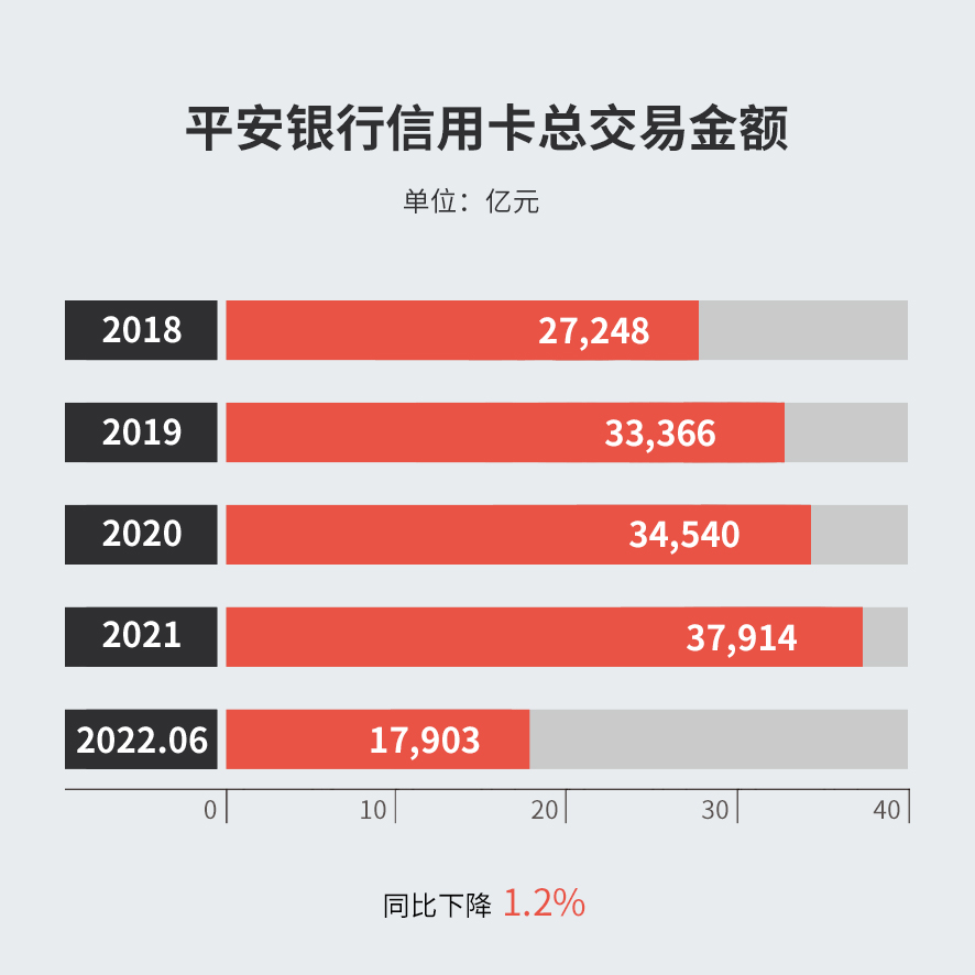 2022年上半年,平安银行信用卡总交易金额17,903.06亿元,主要受疫情影响,同比下降 1.2%。