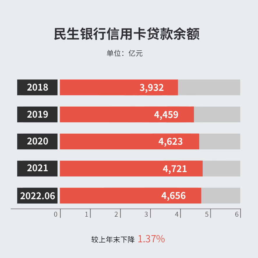 截至2022年6月末,民生银行信用卡贷款余额4,656.05亿元,较上年末下降1.37%。
