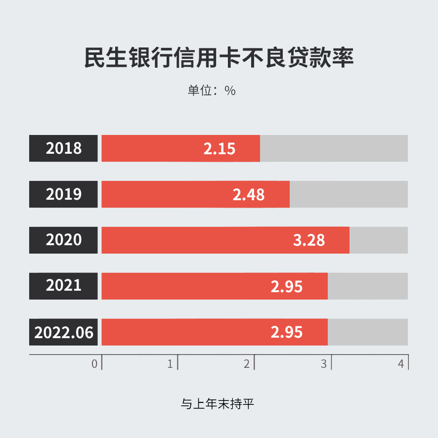 截至2022年6月末,民生银行信用卡不良贷款137.41亿元,较上年末减少1.83亿元;不良贷款率2.95%,与上年末持平。