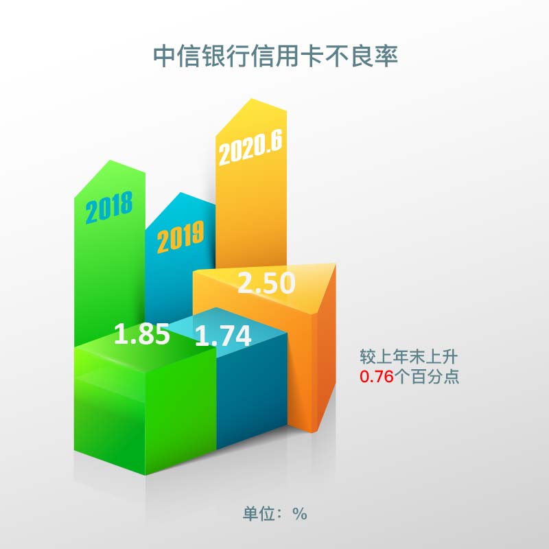截至报告期末,中信银行信用卡不良贷款余额为 120.34 亿元,不良率为2.50%,较上年末上升 0.76 个百分点。截至2019年末中信银行信用卡不良率为1.74%,截至2018年末中信银行信用卡不良率为1.85%。