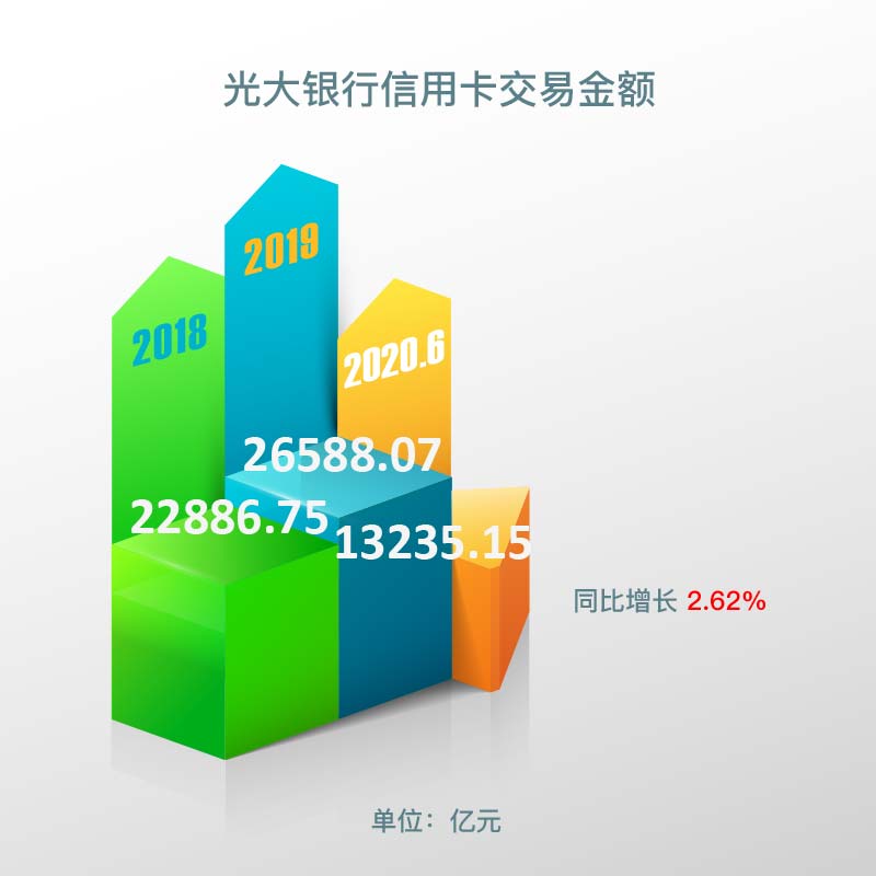 报告期内,光大银行信用卡实现交易金额13,235.15亿元,同比增长 2.62%,2019年光大银行信用卡实现交易金额26,588.07亿元,2018年光大银行信用卡实现交易金额22,886.75亿元。