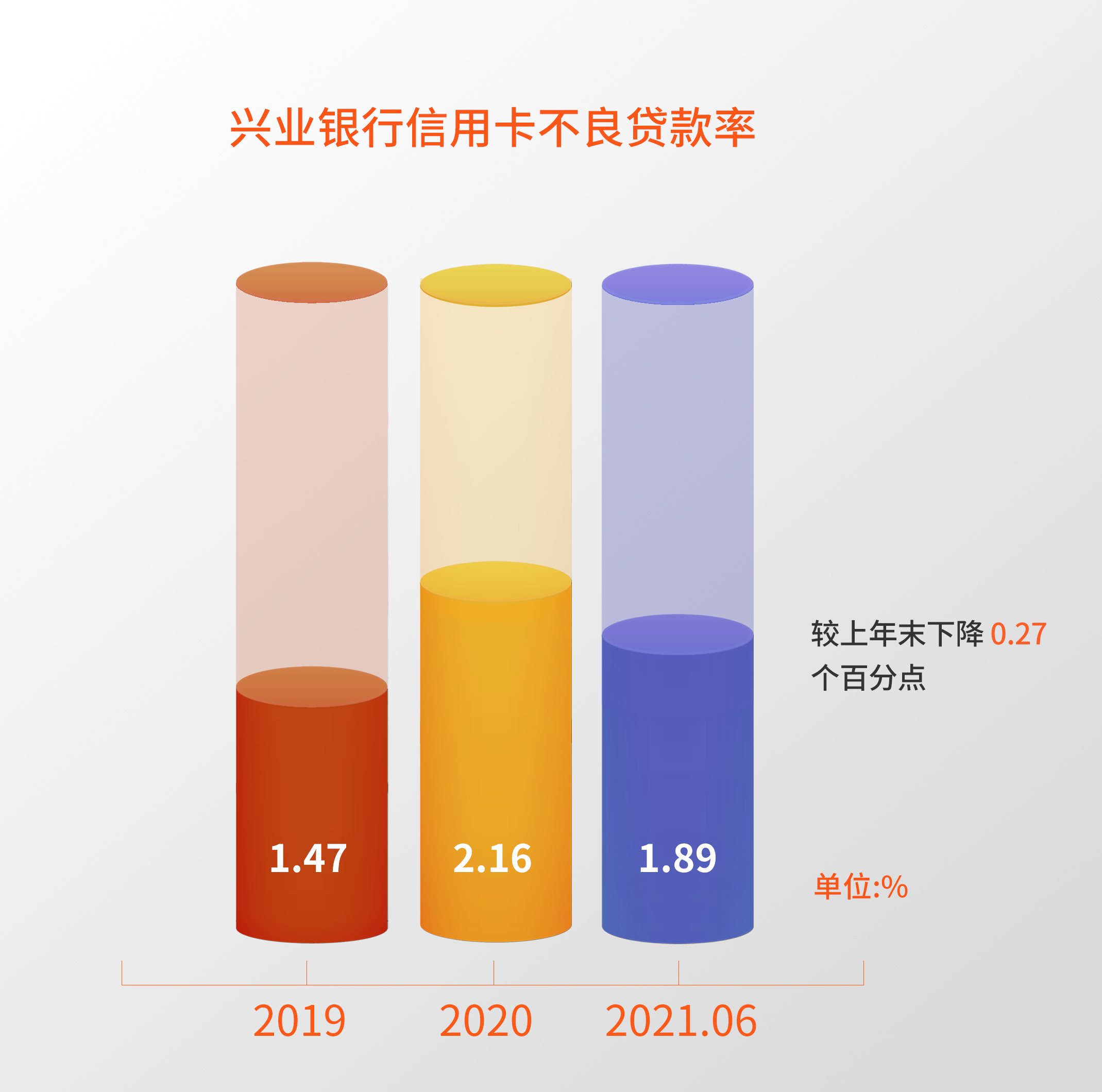 截至2021年6月末,兴业银行信用卡贷款余额4,182.93亿元,不良贷款率1.89%,较上年末下降0.27个百分点。
