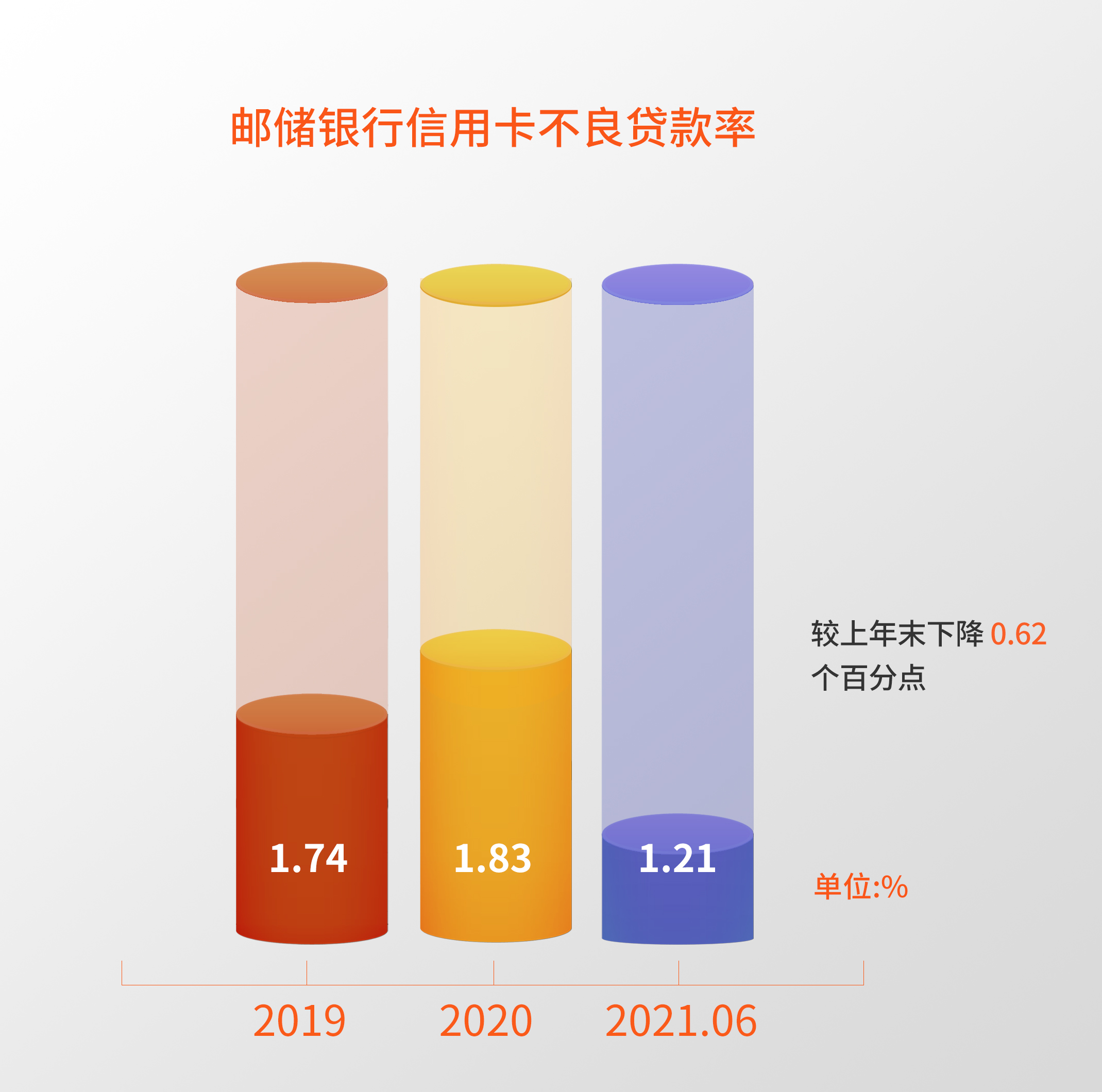 截至2021年6月末,邮储银行信用卡业务不良贷款余额18.77亿元,较上年末下降7.73亿元;不良贷款率为1.21%,较上年末下降0.62个百分点。