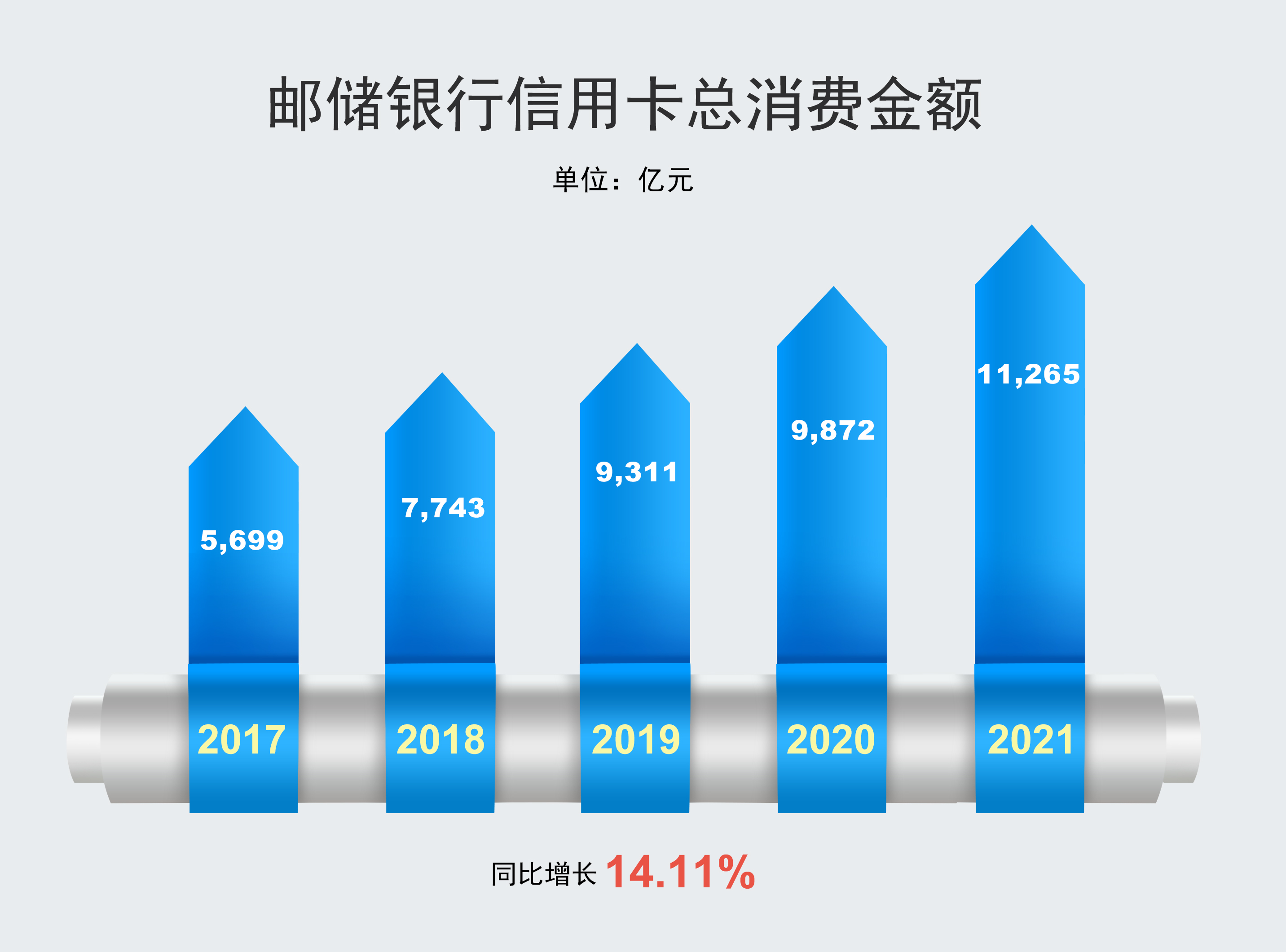 2021年,邮储银行信用卡消费金额11,264.96亿元,同比增长14.11%。