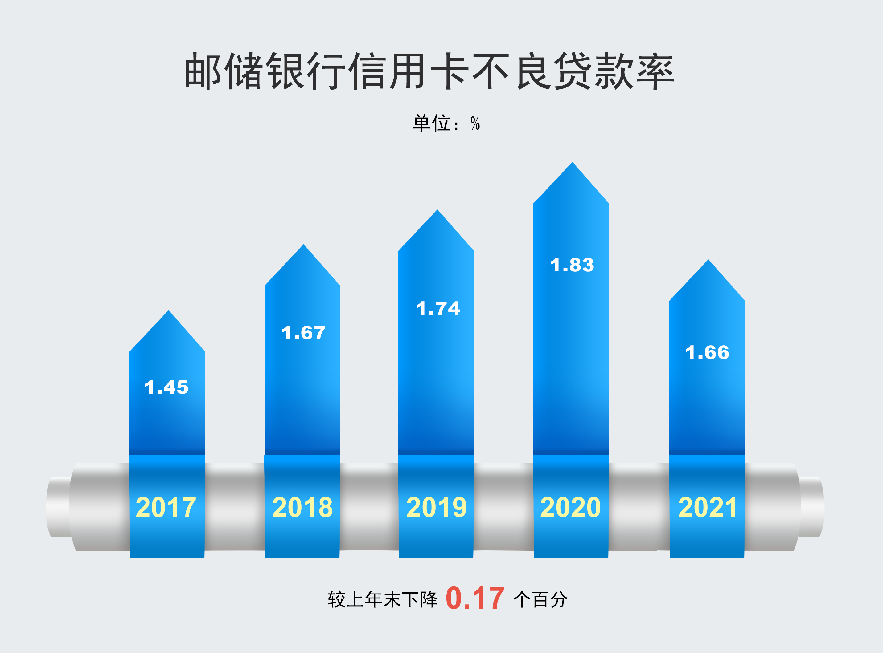 截至2021年末,邮储银行信用卡不良贷款率为1.66%,较上年末下降0.17个百分点。