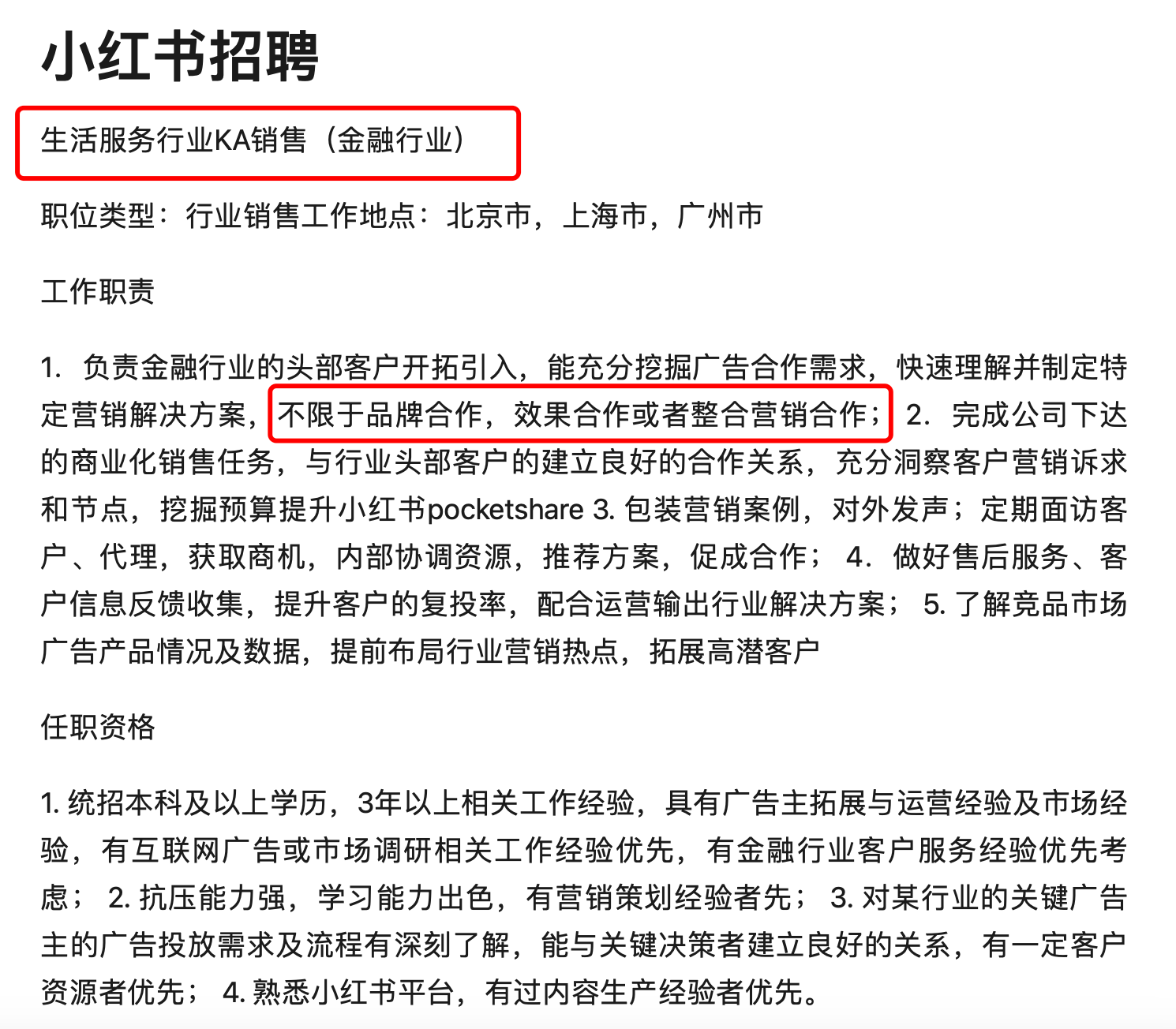 今年上半年至今,小红书一直在招聘金融行业的KA销售,希望引入金融行业的头部客户,挖掘这些客户的广告需求,为这些客户制定营销解决方案。