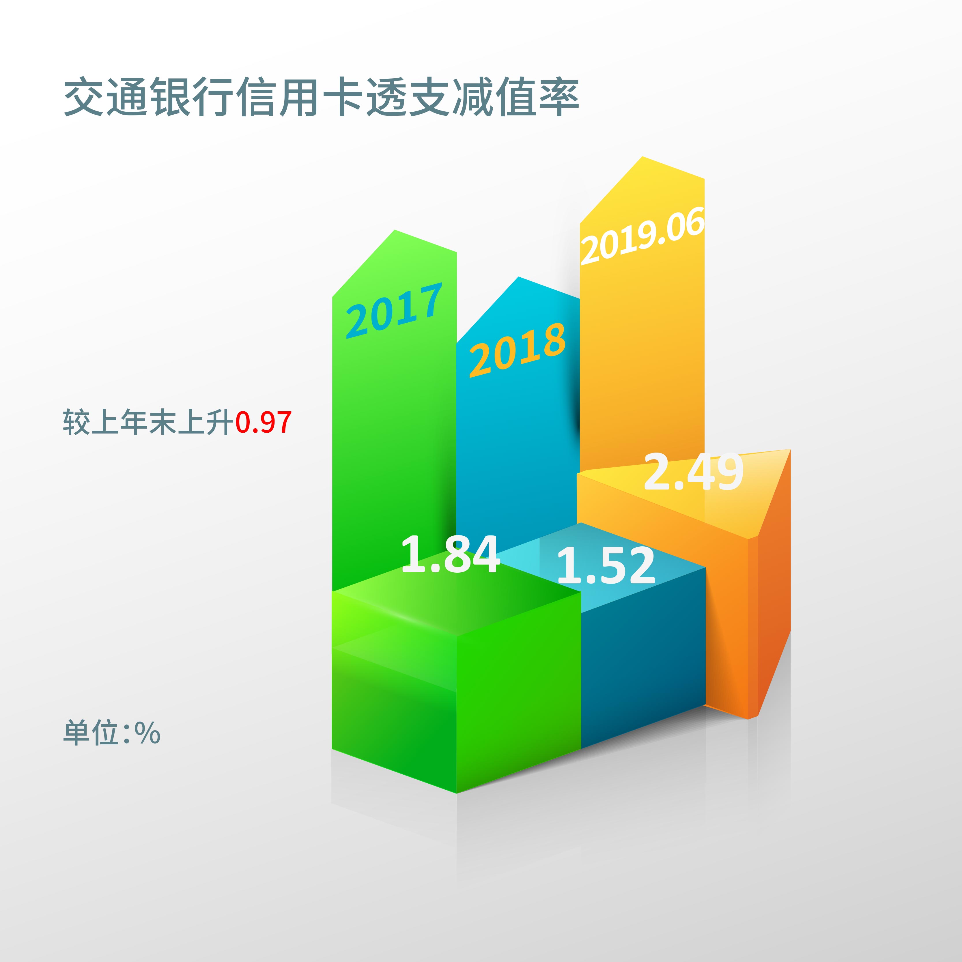 截至报告期末,交通银行信用卡透支减值率为2.49 %,较上年末上升0.97个百分点,据往年年报显示,截至2018年末,该行信用卡透支减值率为1.52%,截至2017年末,该行信用卡透支减值率为1.84%。