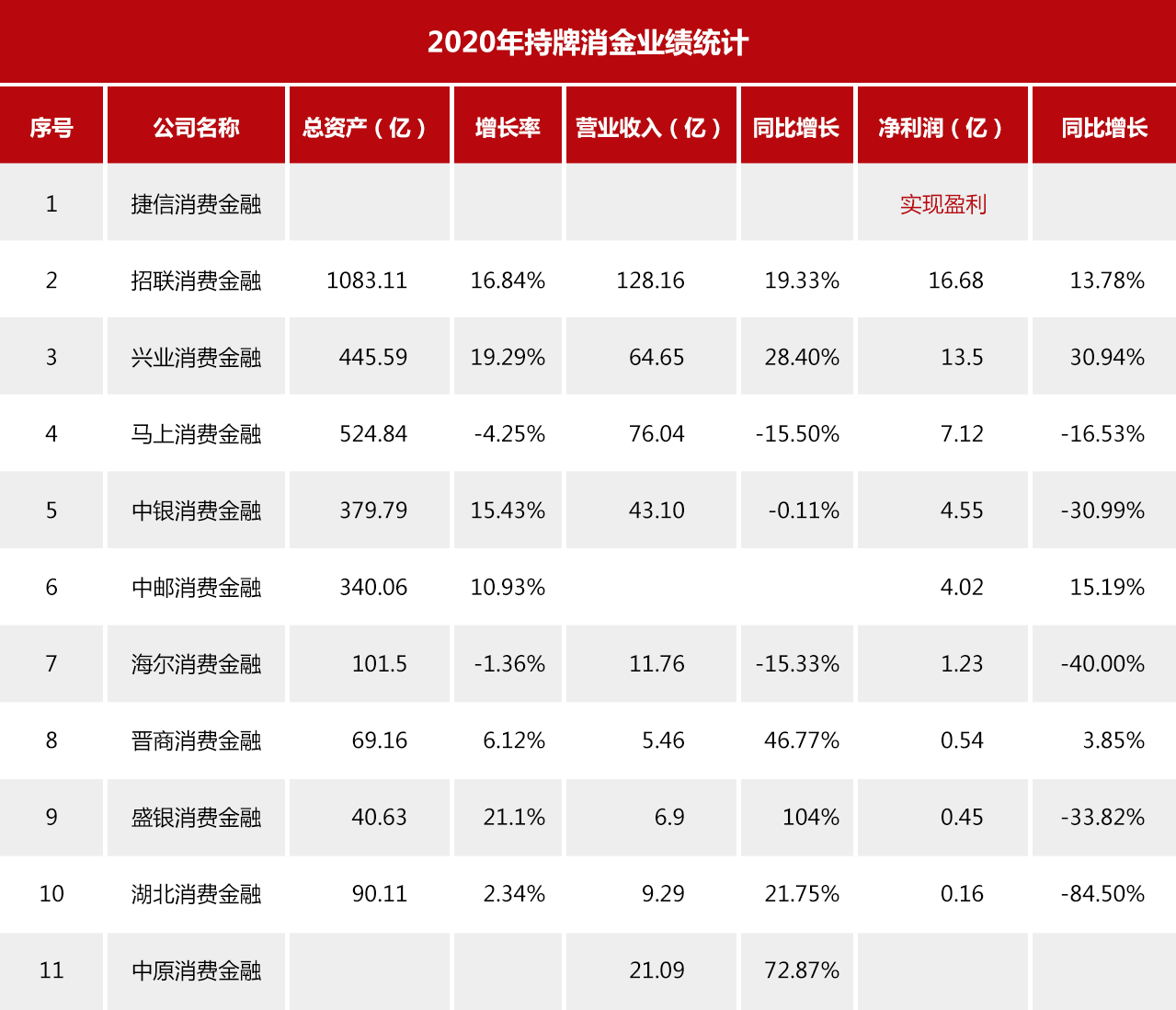 从披露的数据来看,有10家消金公司显示在2020年实现盈利,1家未公布其净利润。