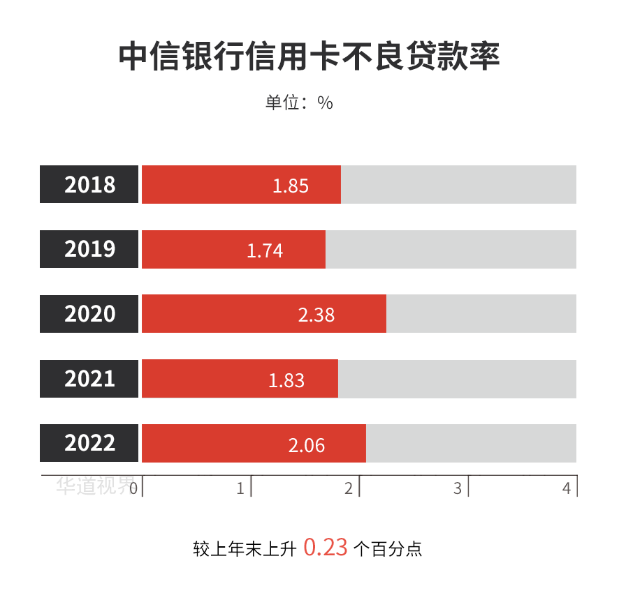 2022年,中信银行实现信用卡业务收入598.23亿元,同比增长1.18%;