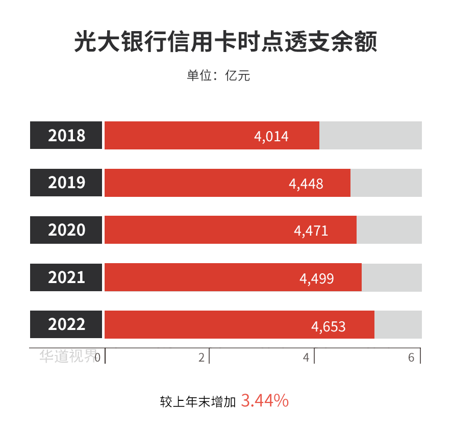 截至报告期末,光大银行信用卡时点透支余额 4,653.48 亿元 (不含在途挂账调整),比上年末增长 3.44%;