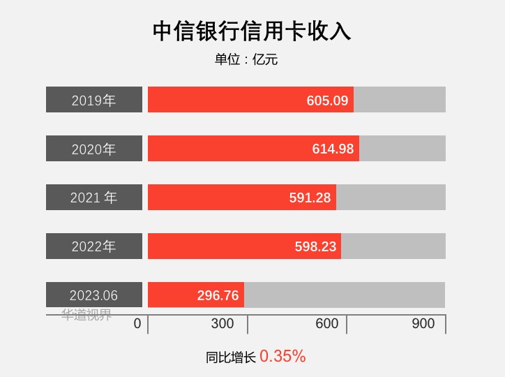 2023年上半年,中信银行实现信用卡业务收入 296.76 亿元,同比增长 0.35%;