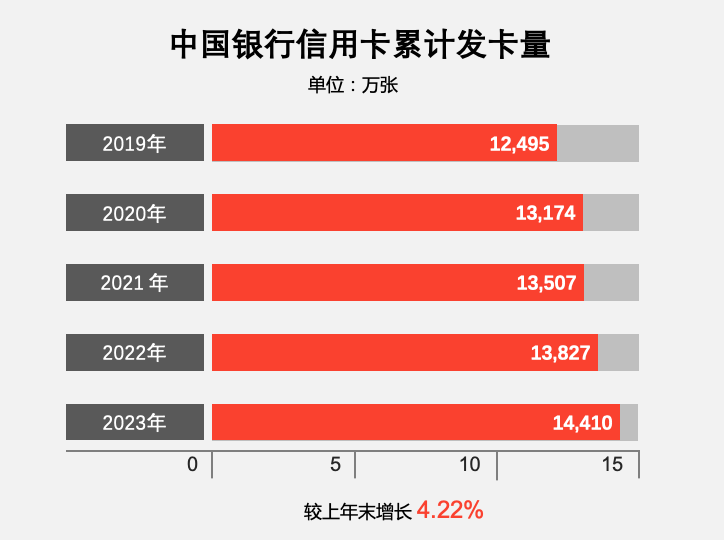 截至2023年末,中国银行信用卡累计发卡量14,410.19万张,同比增长4.22%;