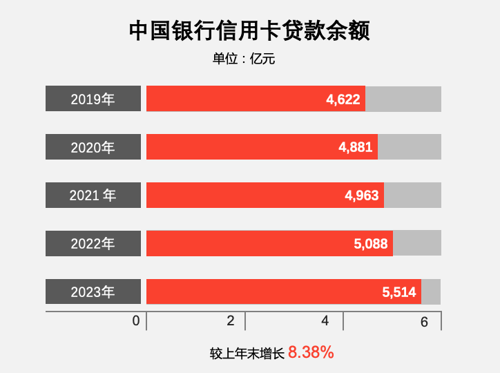 截至2023年末,中国银行信用卡贷款余额5,513.66亿元,同比增长8.38%;
