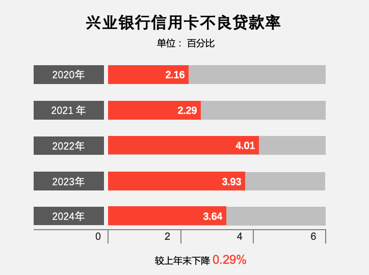 截至2024年末,兴业信用卡不良贷款率3.64%,较上年末下降0.29个百分点,逾期率6.32%,较上年末下降0.43个百分点,风险进一步回落。
