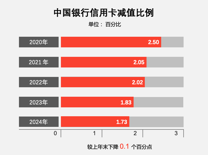 截至2024年,中国银行信用卡减值比例1.73%,较上年末下降0.1个百分点。