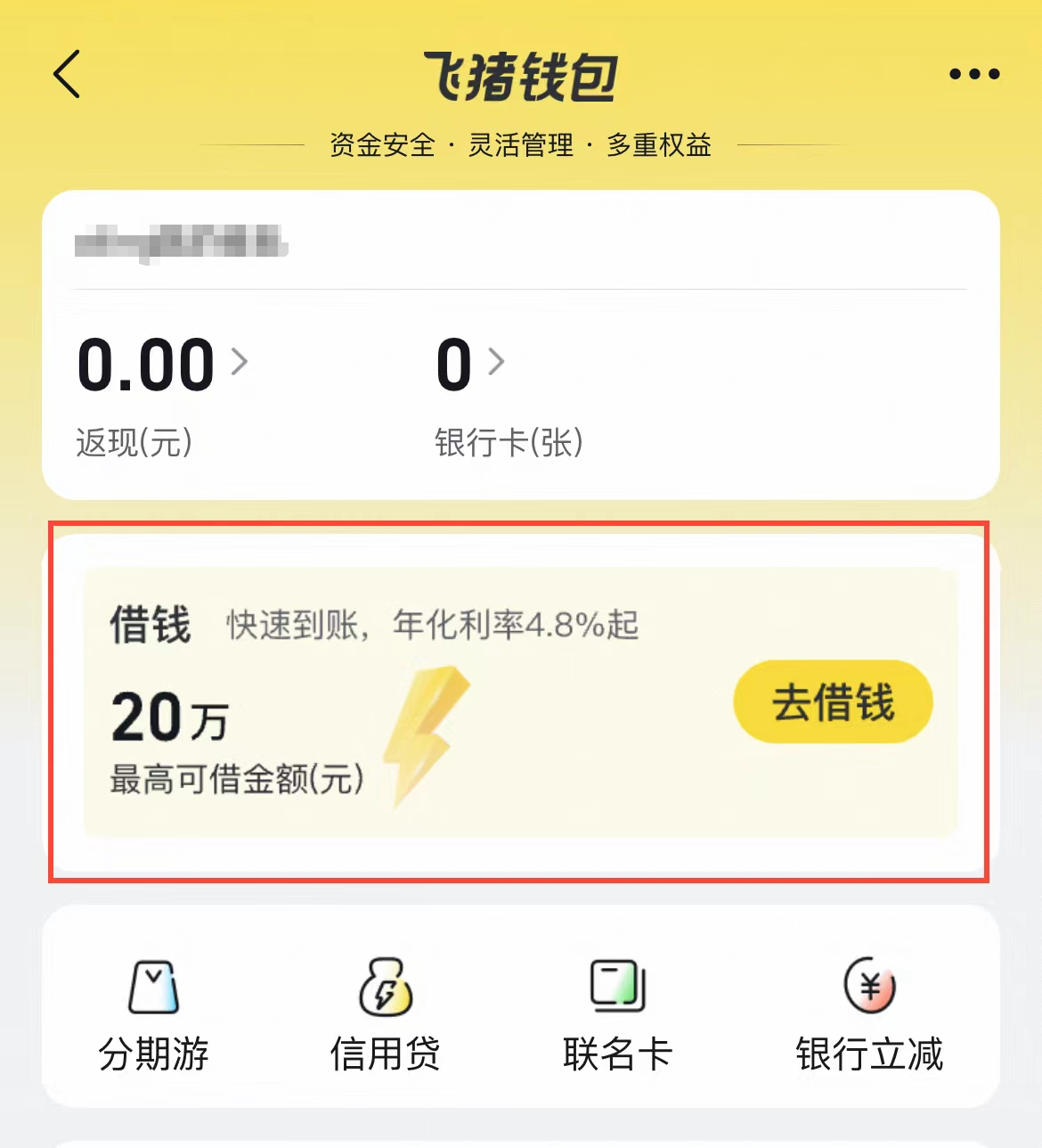 数亿用户量,阿里系平台,头部OTA,活跃场景金融,诸多光环加身的飞猪,开始加速布局消费金融。作者独家获悉,阿里旗下在线旅游平台飞猪旅行已上线信用贷产品,产品位于飞猪钱包内,定位于一款全线上化的消费信贷产品。目前,飞猪借钱服务仅在飞猪App中展示。产品信息显示,飞猪信用贷最高额度20万元,年化利率4.8%起。从业务类型来看,飞猪信用贷属于助贷业务,贷款资金由金融机构提供,飞猪主要提供获客支持和信息展示。飞猪信用贷当前在资金端层面合作了银行、消金公司和头部助贷平台,如新网银行、中原消金、度小满、拍拍贷。严格挑选合规资方作为信贷业务合作伙伴,可见飞猪在消金业务布局上比较谨慎。虽然飞猪在借钱业务中不涉及风控、贷后等环节,但飞猪也为合作伙伴提供平台数据服务支撑。根据飞猪信用贷服务协议,贷款具体服务,如资质校验、信用评估、资金借贷等,由金融机构提供。基于借钱服务的特性,用户须同意飞猪将身份基本信息以及在飞猪平台使用行为数据、消费订单、会员等信息形成的履约能力判断信息,提供给金融机构及征信机构,以便金融机构评估授信额度及提供借款服务。飞猪还布局信用卡业务,推出飞猪联名卡,并联合发卡行上线分期游服务。目前飞猪已与浦发银行、交通银行合作联名卡发卡业务,通过在线旅游权益绑定,推动联名卡业务扩张。此前,飞猪还涉足了旅行保险、“旅行宝”(与余额宝合作)、信用住和信用游等业务。今年年初,飞猪还推出了一款名为“猪小金”的攒钱产品,用户在飞猪合作的银行开设账户进行攒钱,平台则根据用户银行账户余额计算权益并进行返现。“猪小金”虽然名义上为合作银行账户权益增值及消费活动,实际攒钱性质为银行活期存款,或因该业务涉及三方平台互联网存款嫌疑,目前飞猪钱包中已不见其踪影。在商户金融端,飞猪借助平台内的企业客户优势,也有望打开局面。去年,飞猪就曾透露其正联合多家银行制定中小旅游企业低息金融支持方案,为商家提供可在线上随借随还的无抵押低息贷款。从个人金融到企业金融,飞猪的互联网金融版图逐渐成型。尽管相比其他头部OTA平台,飞猪的金融业务布局较晚,体量较小,甚至相比阿里系的其他平台也布局较晚,但飞猪凭借自身的用户流量基础以及阿里体系的信贷服务能力,做出一番成绩也无不可能。早在2016年品牌升级时,飞猪总裁就透露平台用户数已经超过2亿,App下载量超过1亿,日均访问用户数达1000万。目前,飞猪已经形成在线旅游服务综合生态,业务涵盖酒店、机票、火车票、租车、门票、旅游、顺风车等板块,是国内排名靠前的在线旅游平台。流量和场景兼备,飞猪成为下一个热门的资产端,有戏。