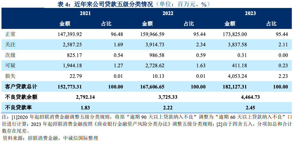 截至 2023 年末,按照逾期 60 天以上贷款纳入不良口径计算,招联消费金融不良贷款余额较上年末增长 19.85%至 44.65 亿元,不良贷款率较上年末上升 0.23 个百分点 至 2.45%。
