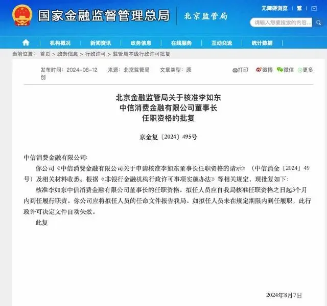 8月12日,国家金融监督管理总局北京监管局公示了中信消费金融有限公司(下称“中信消费金融”)董事任职资格的批复,核准李如东担任中信消费金融董事长的任职资格、邵冰及朱立群担任中信消费金融董事的任职资格。