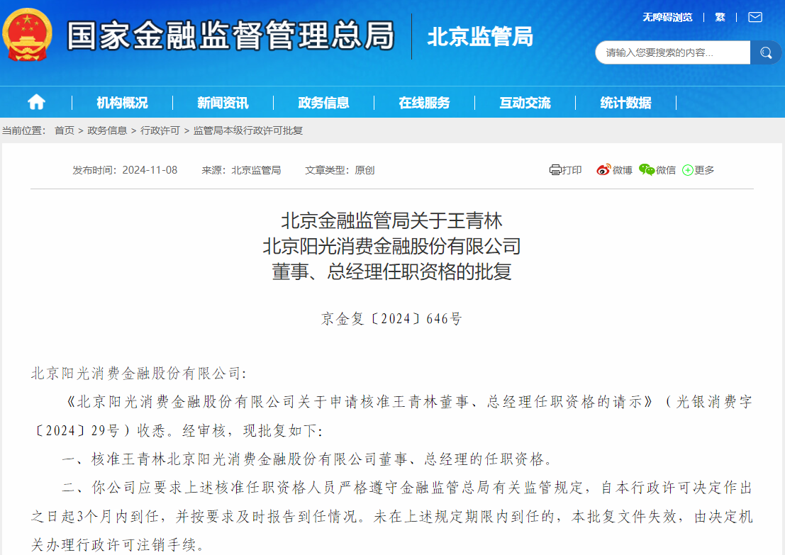 近日,北京金融监管局发布任职批复,核准王青林北京阳光消费金融股份有限公司董事、总经理的任职资格。