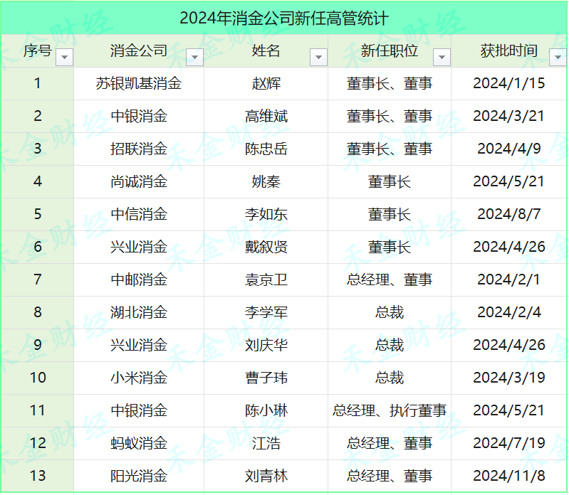 今年消金公司高管变动格外频繁。截至目前,包括阳光消金在内,已有13家机构出现董事长或总经理更替。