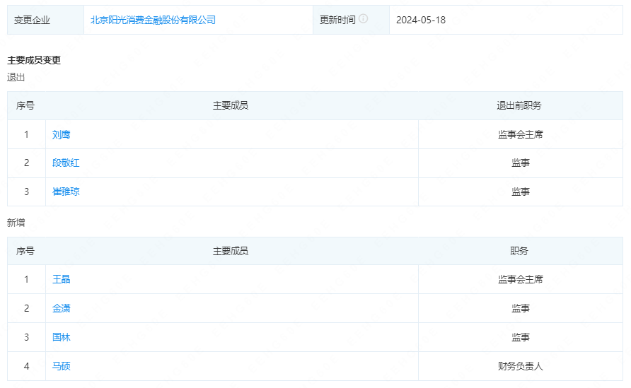 除了总经理变更,今年5月份阳光消金监事会主席和两名监事也进行了更替,同时新增一名财务负责人。