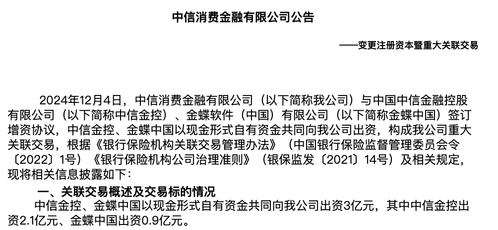 根据协议,中信金控和金蝶中国将以现金形式等比例共同出资3亿元,其中中信金控出资2.1亿元,金蝶中国出资0.9亿元。此次增资完成后,中信消费金融公司的注册资本将由7亿元提升至10亿元。今年以来,消费金融公司增资扩股频现,一方面利于业务规模扩张外,另一方面也是为了满足监管要求。根据今年3月份最新修订的《消费金融公司管理办法》,消费金融公司注册资本实缴货币10亿元及以上,主要出资人持股比例50%以上。4月份,宁波银行公告,将与宁波金控共同为宁银消金增资至45亿元;9月份,长银五八消金获批增资,10月份完成工商变更,注册资本由由9亿元增加至11.24亿元;10月份,海尔消金注册资本由15亿元增加至20.9亿元;继南银法巴消金引进新外资股东国际金融公司注册资本增加至52.15亿元后,12月份再次审议通过增资议案,拟增资至60亿元。目前业内不满10亿注册资本的仅剩7家,分别为盛银消费金融:注册资本金为3亿元;唯品富邦消费金融:注册资本金为5亿元;晋商消费金融:注册资本金为5亿元;蒙商消费金融:注册资本金为5亿元;厦门金美信消费金融:注册资本金为5亿元幸福消费金融:注册资本为6.37亿元;北银消费金融:注册资本为8.5亿元。