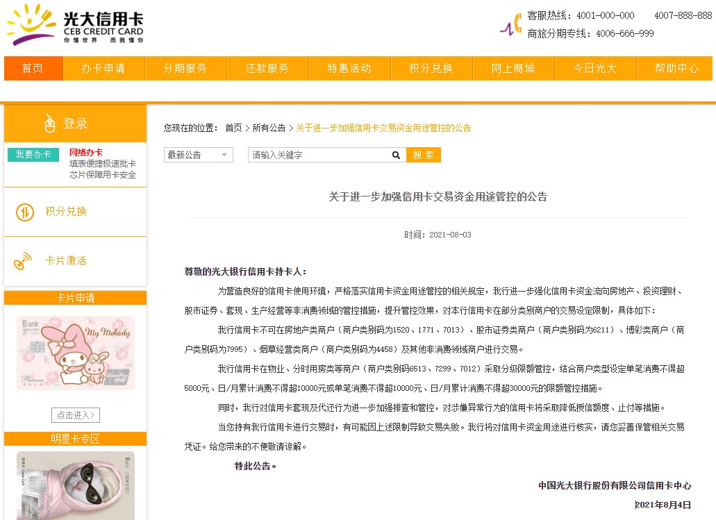 无独有偶,光大银行在8月4日也发布了《关于进一步加强信用卡交易资金用途管控的公告》,公告表示对信用卡套现及代还行为进一步加强排查和管控,对涉嫌异常行为的信用卡将采取降低授信额度、止付等措施。