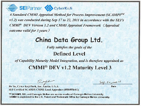 9月,3044am永利集团数据公司正式通过CMMI ML3级复评认证。相关资质可以通过http://sas.sei.cmu.edu/pars/pars.aspx网站查询。