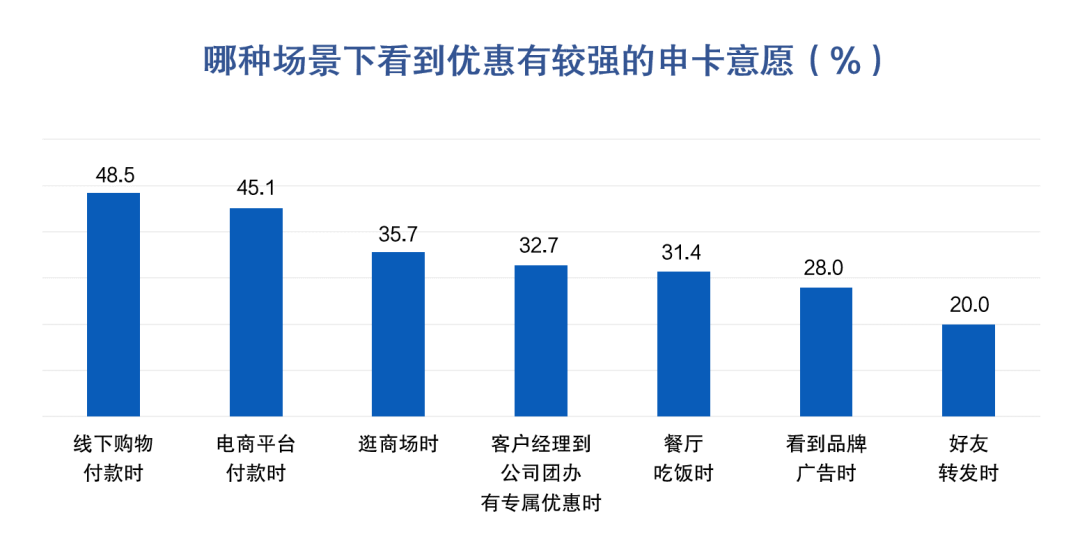 80%的信用卡新户认为,营销活动是申请信用卡时的首要考虑因素,进一步追问后发现,息费合理、用卡安全和卡片主题是驱动用户做出申请决策的重要因素。