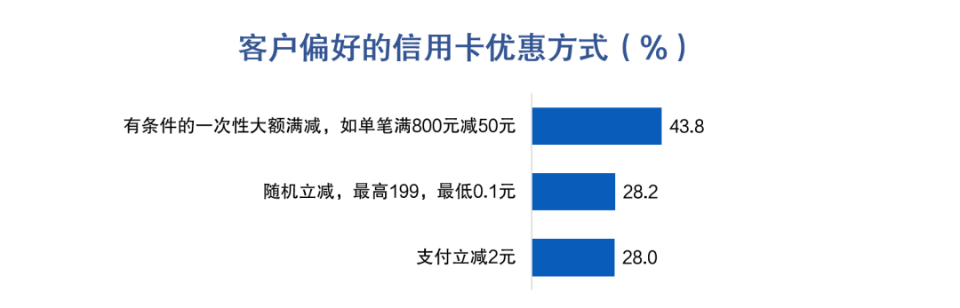 在营销触达形式上,在消费提醒中加入优惠信息的尾随营销形式能够提升近80%用户的用卡意愿;在活动形式方面,“随机立减”和“满额立减”最受欢迎,其次是“电商平台支付立减,如京东等”和“积分”;在优惠策略方面,44%的受访者偏爱“有条件的一次性大额满减”,从年龄维度看,18-24岁客群对“支付立减”更感兴趣。