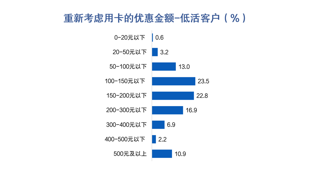 就低活(超过60天未使用某张信用卡)客户来说,网购电商平台、直播类网站以及外卖平台的优惠相对来说更能提高用卡意愿。当被问及“给予多少优惠金额、会让您考虑重新使用这张信用卡”时,大部分受访者的期望金额在100-200元。