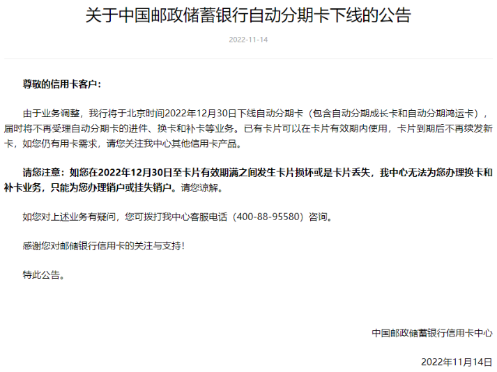 邮储银行表示,将于2022年12月30日下线自动分期卡(包含自动分期成长卡和自动分期鸿运卡),届时将不再受理自动分期卡的进件、换卡和补卡等业务。