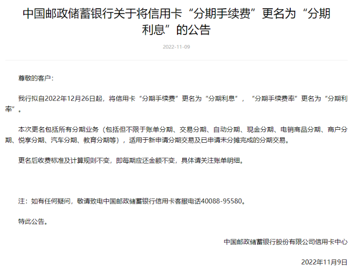 11月9日,邮储银行公告称,拟自2022年12月26日起,将该行信用卡“分期手续费”更名为“分期利息”,“分期手续费率”更名为“分期利率”。
