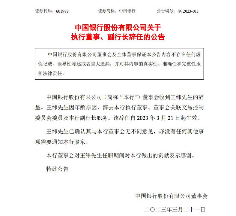 3月21日,中国银行发布公告称,该行董事会收到王纬的辞呈。因年龄原因,王纬辞去中行执行董事、董事会关联交易控制委员会委员及副行长职务。该辞任自2023年3月21日起生效。