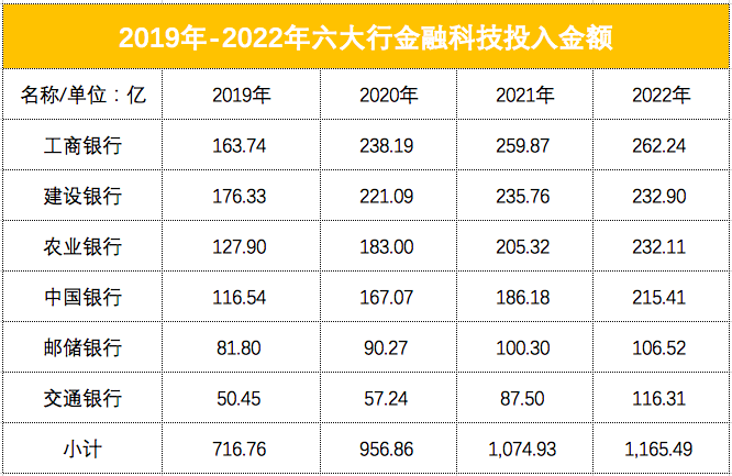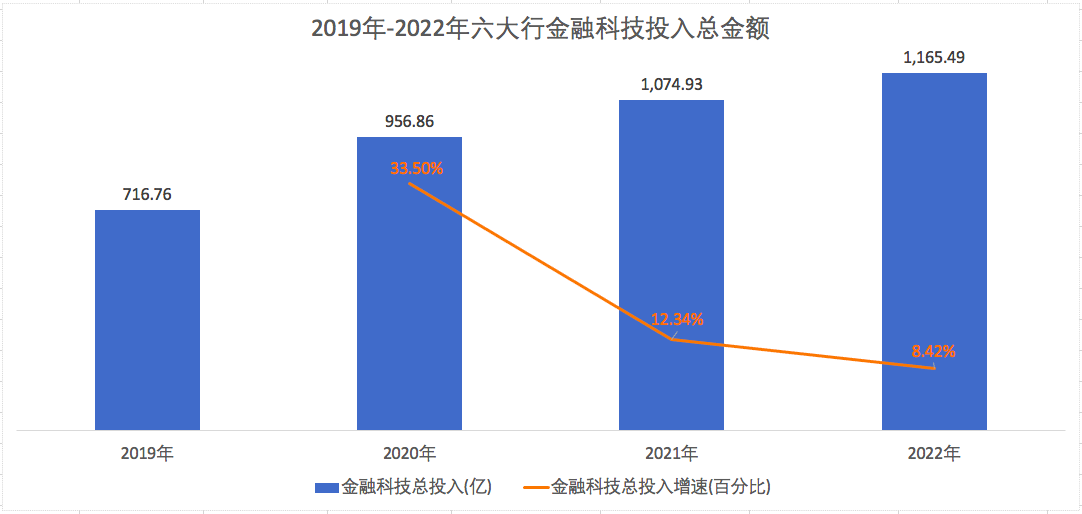 2019年到2022年,六大行金融科技的总投入分别为716.76亿、956.86亿、1,074.93亿和1,165.49亿元,呈逐年上升的趋势,但增速逐年下降,截止2022年,六大行金融科技投入增速已放缓至8.24%。