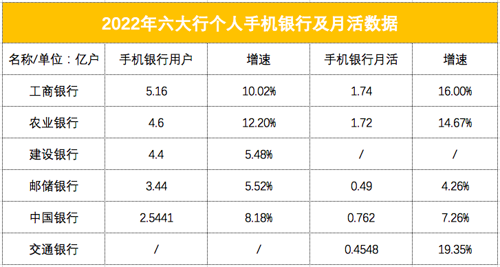建设银行个人手机银行用户数4.4亿户,较上年增长5.48% ,高粘性客户规模不断提升;中行手机银行用户为2.54亿户,但月活数量已达到7620万户,活跃度可见一斑,交易额达46.73万亿元,同比增长18.67%。
