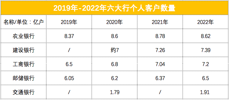 建行、工行位列其后,2022年个人客户数量分别为7.39亿户和7.2亿户,从2019年至2022年,逐年稳定增长。