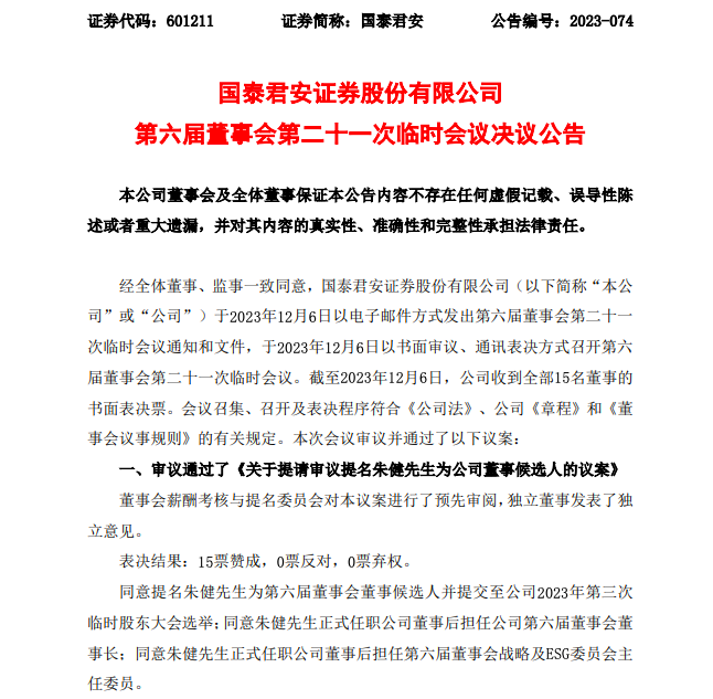 12月7日,国泰君安发布公告称,任命朱健先生为第六届董事会董事候选人并提交至公司2023年第三次临时股东大会选举;同意朱健先生正式任职公司董事后担任公司第六届董事会董事长;同意朱健先生正式任职公司董事后担任第六届董事会战略及ESG委员会主任委员。