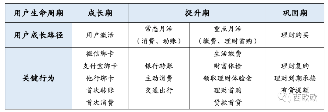 结合银行的客户生命周期和成长路径,以处于经营期的客户的三个阶段为例,针对客户的关键行为做简单梳理(下表)。
