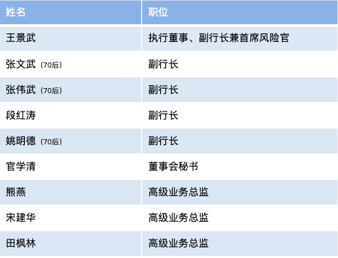 目前,工行管理层分别为执行董事、副行长兼首席风险官王景武,副行长张文武、张伟武、段红涛和姚明德,董事会秘书官学清,高级业务总监熊燕、宋建华、田枫林,行长位置暂时空缺。