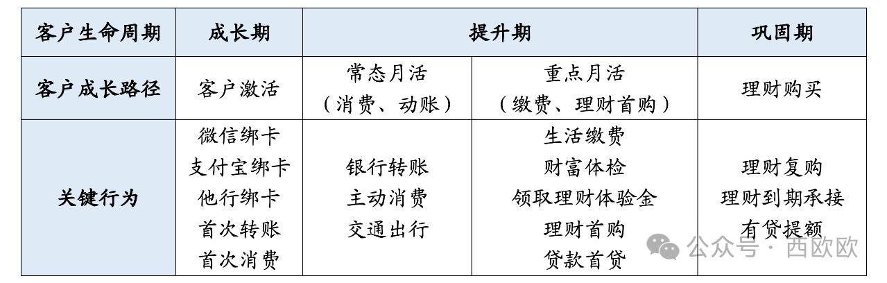 如下表所示,结合银行的客户生命周期和成长路径,以处于经营期客户的三个环节为例,针对客户的关键行为作简单梳理。