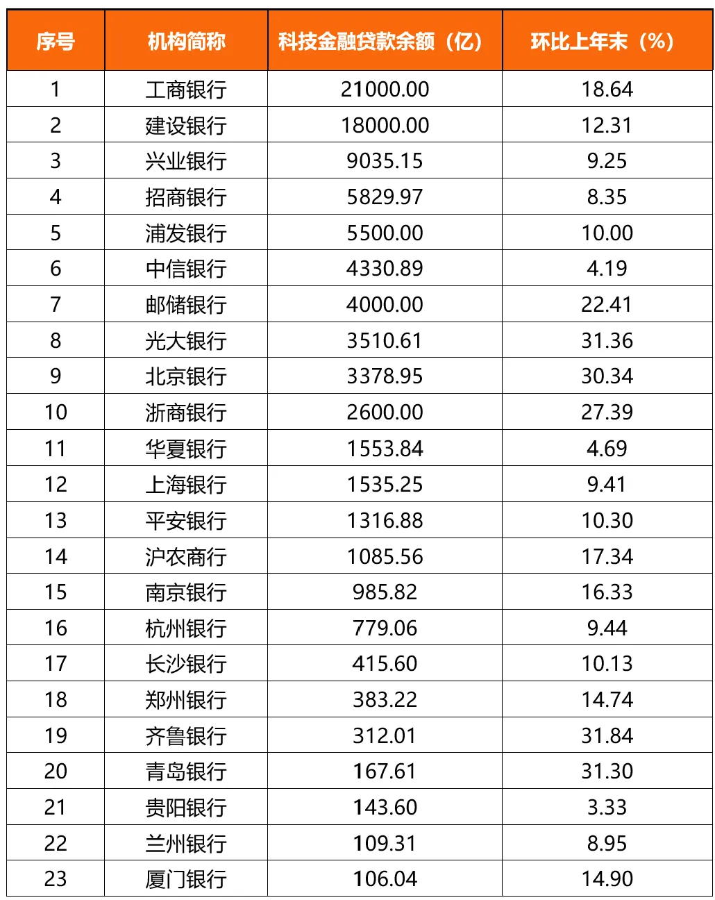 股份行中,兴业银行、招商银行、浦发银行、中信银行等4家科技金融贷款余额均超越邮储银行,突破4000亿元。
