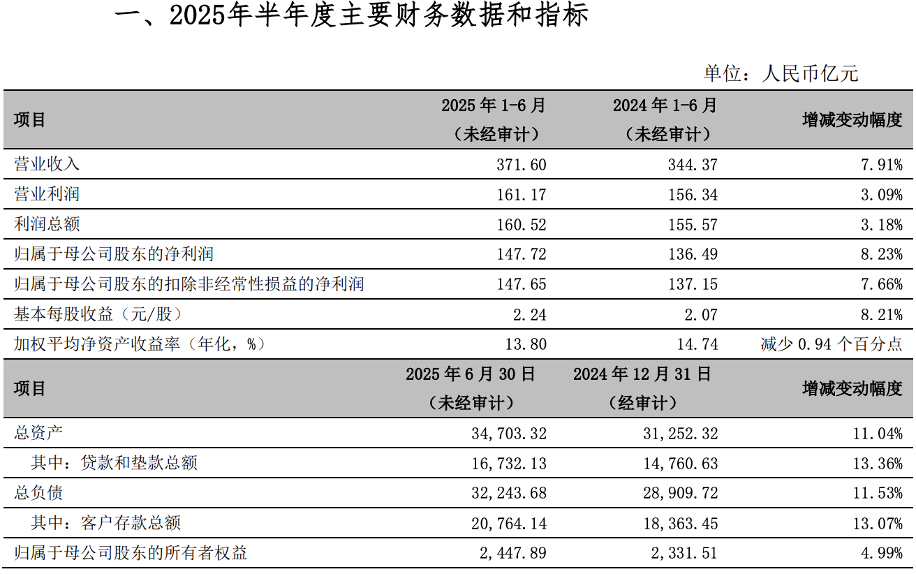 2025年上半年,宁波银行营业收入371.60亿元,较上年同期增长7.91%;实现归属于母公司股东的净利润147.72亿元,较上年同期增长8.23%;年化加权平均净资产收益率13.80%。