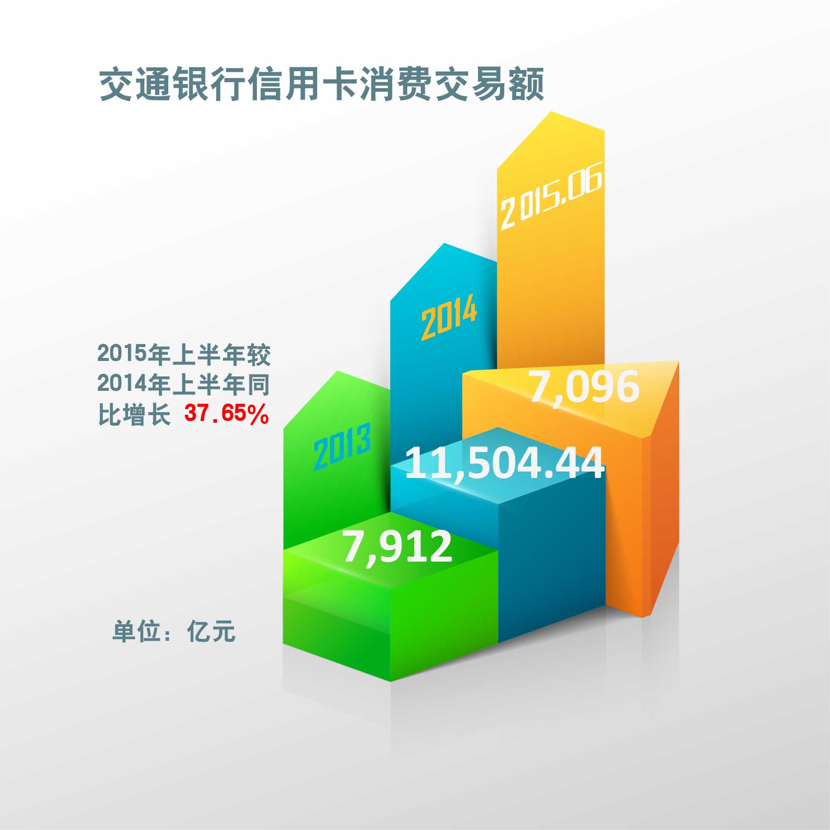截止2015年6月末,交行信用卡累计消费额达人民币7,096亿元,同比增长37.65%。